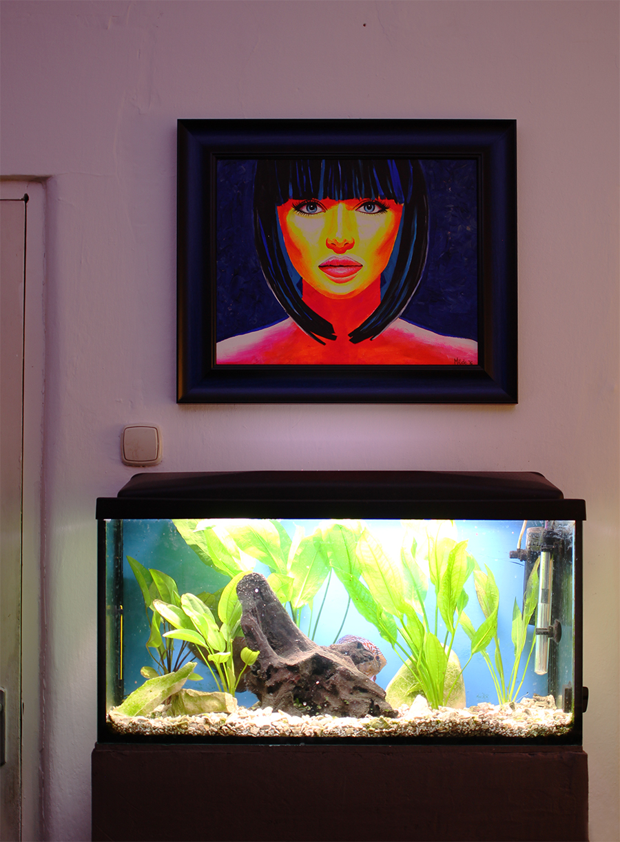 Kleopatru som zavesila nad akvárko, lebo farby pod vhodným svetlom v tme žiaria.