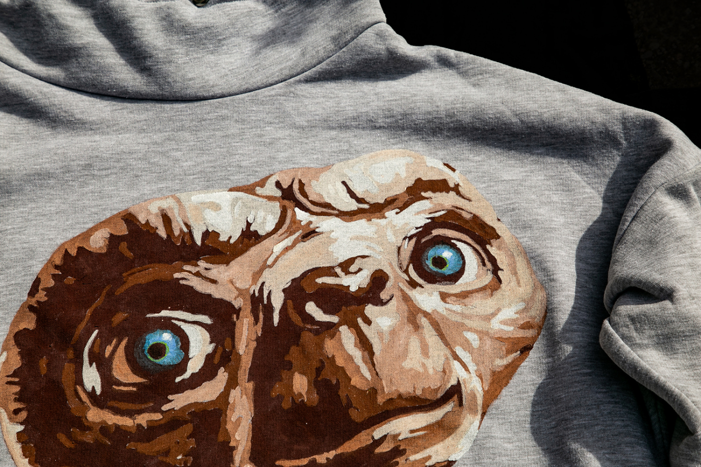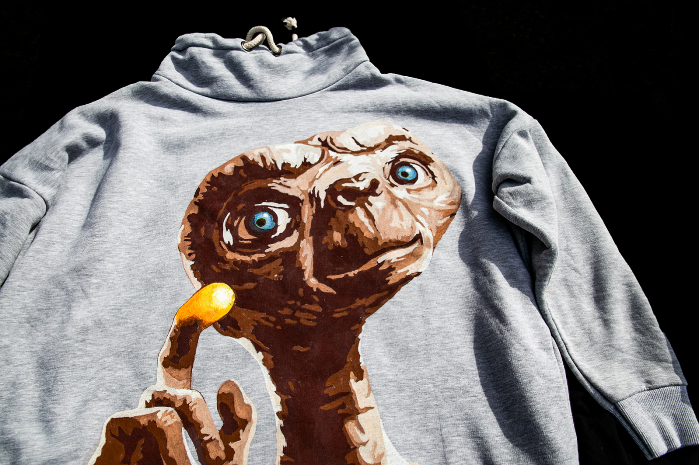 Ručne maľovaný E.T. Kvalitné farby na textil, následne žehličkou tepelne zafixované. Nápis E.T. na zadnej strane mikiny je vyrobený z nažehľovacieho flexu (pogumovaná nažehľovacia fólia).