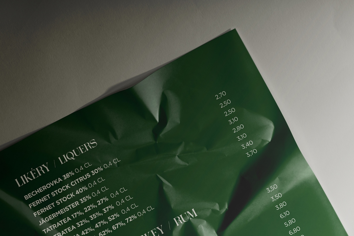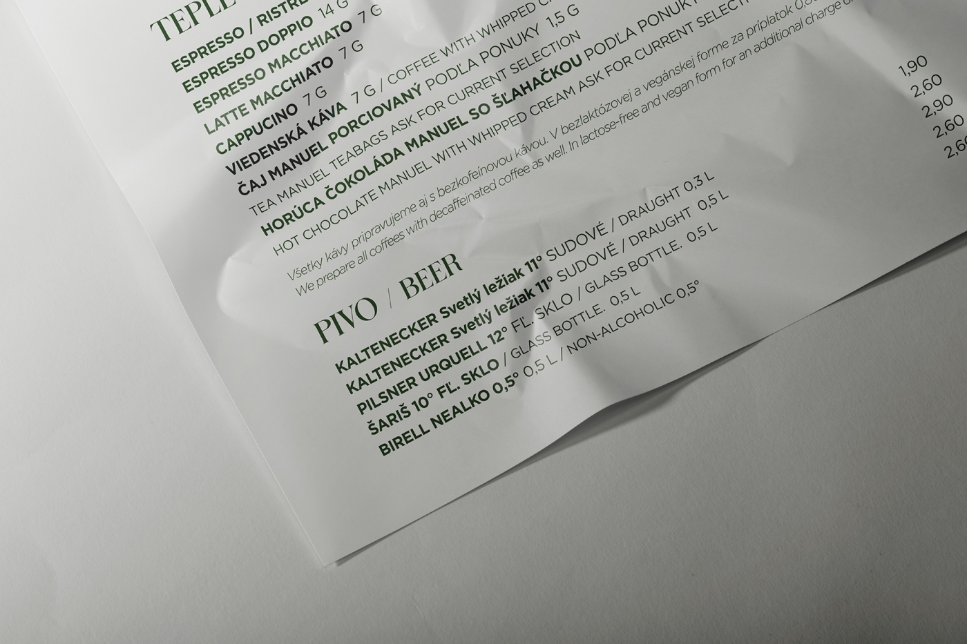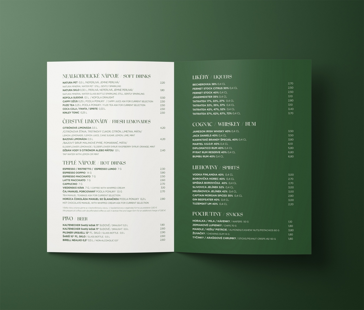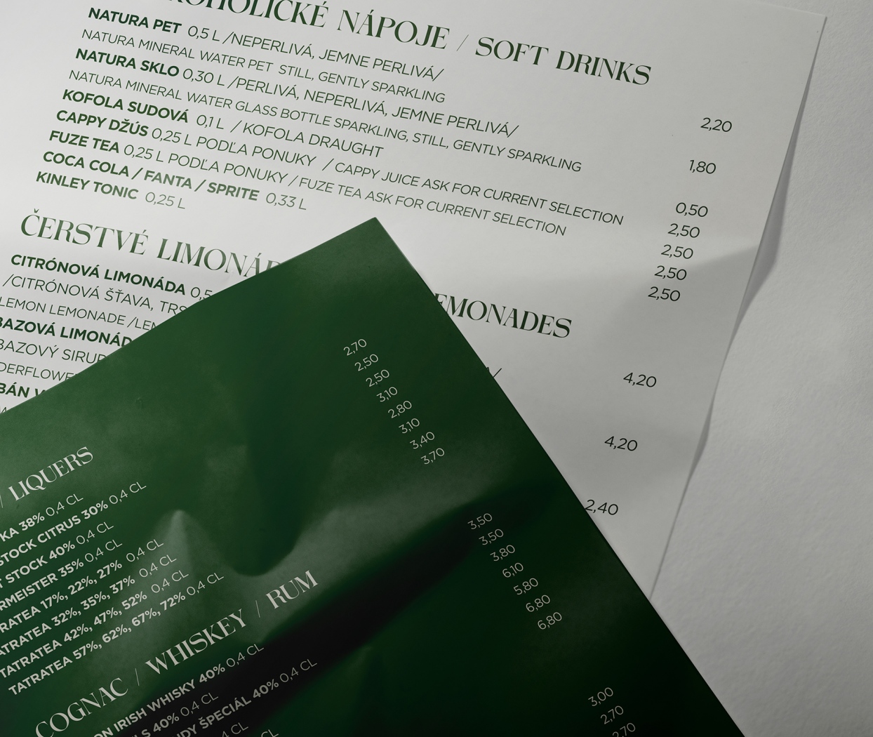 Jednostránkový nápojový lístok pre penzión Lomnicky