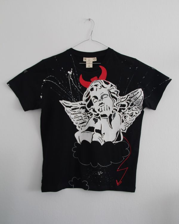 Čierne bavlnené tričko (bavlna 100 %) s krátkym rukávom. Ručne maľované kvalitnými farbami na textil a následne tepelne zafixované. Starostlivosť: prať aj žehliť naruby na teplote uvedenej na textílii. Nebieliť a nečistiť chemicky. Na tričku: Anjel, čert, joint