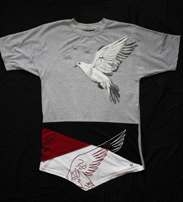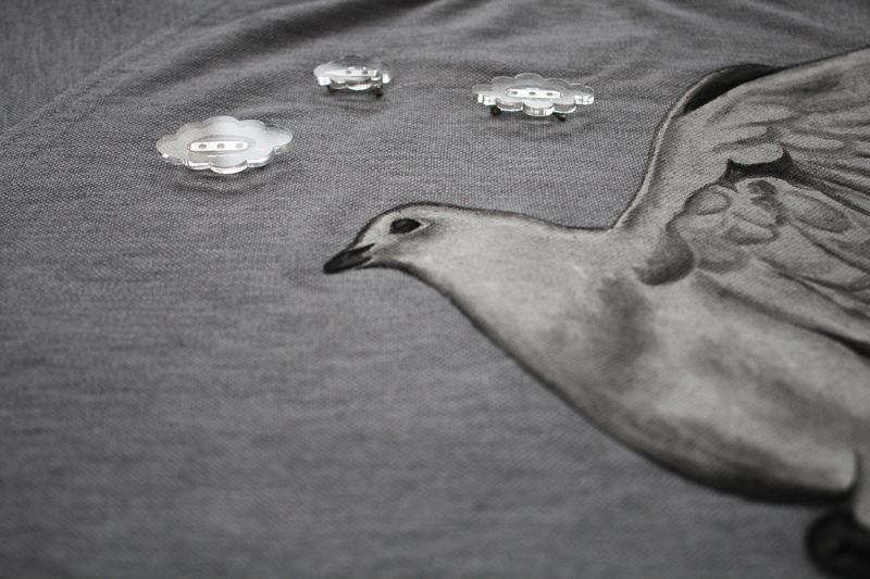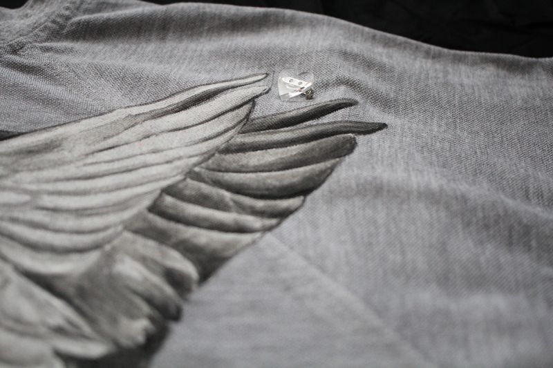 Šedé bavlnené tričko (bavlna 100 %) s krátkym rukávom. Ručne maľované kvalitnými farbami na textil a následne tepelne zafixované. Oblaky a srdiečko rezané z plexiskla ako odznak, dodplnené o nažehlovaciu fóliu v podobe krídiel v spodnej časti. Tričko bolo pre maľovanie vopred dodané, strih trička je možné nahradiť klasickým šedým tričkom. Starostlivosť: prať aj žehliť naruby na teplote uvedenej na textílii. Nesušiť v sušičke, nebieliť, nečistiť chemicky.